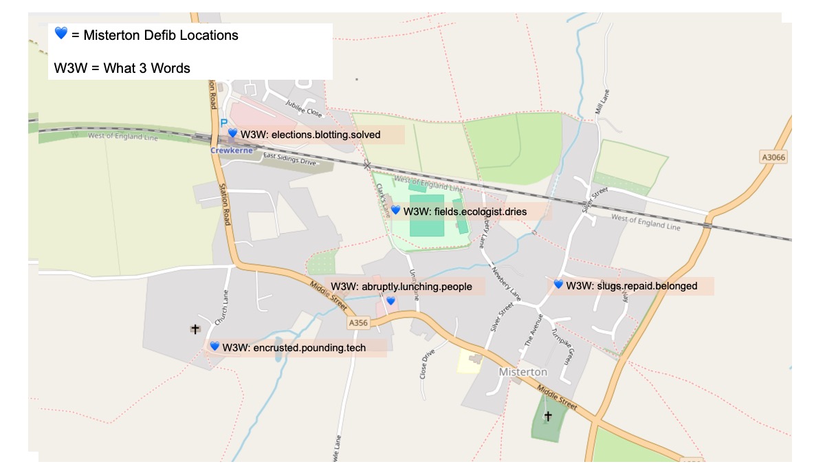 There are 5 automated external defibrillators (AEDs) located around Misterton. Three of these are owned and maintained by Misterton Parish Council through the Misterton Resilience Team. The other two are owned by South Western Railway and the AH Warren Trust but are kindly made available for public use.